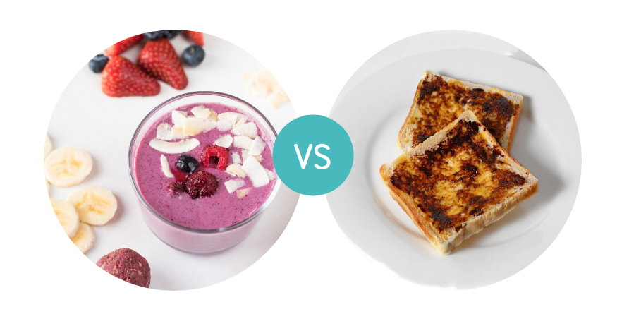 Fibre in quantities of more than 3g per serve is a good choice, so both breakfasts are winners in terms of fibre. However, the smoothie will provide your body with unprocessedcarbohydrates - dietary fibre, vitamins and minerals from fruits and vegetables, which Australian’s are definitely not eating enough of.