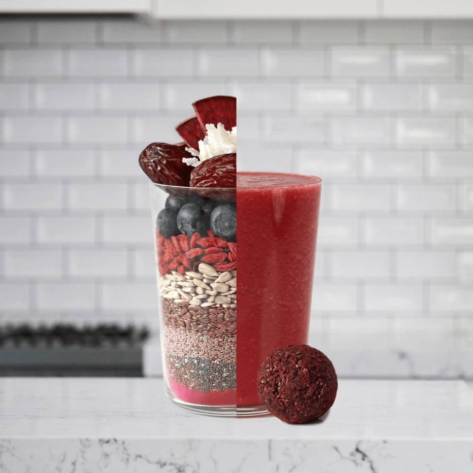 Dates, LSA, Organic Psyllium Husk, Organic Chia Seeds, Organic Goji Berry, Organic Beetroot Powder, Organic Blueberries, Organic Coconut Oil, Acai Powder, Natural Raspberry Flavour