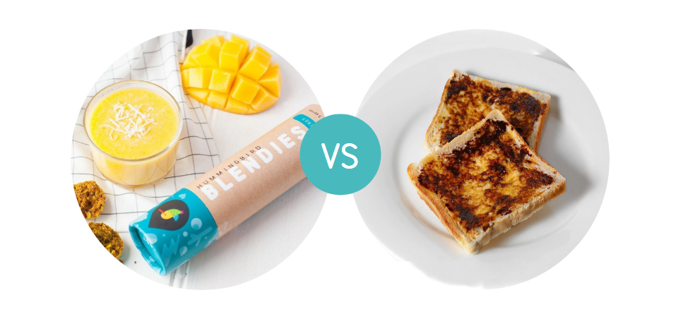 Fibre in quantities of more than 3g per serve is a good choice, so both breakfasts are winners in terms of fibre. However, the smoothie will provide your body with unprocessedcarbohydrates - dietary fibre, vitamins and minerals from fruits and vegetables, which Australian’s are definitely not eating enough of.